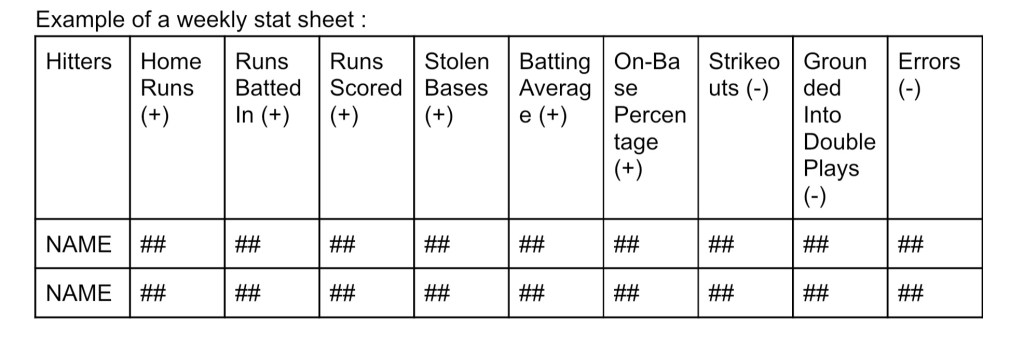 - The team with the better stat in a category gets a point (e.g., most home runs).